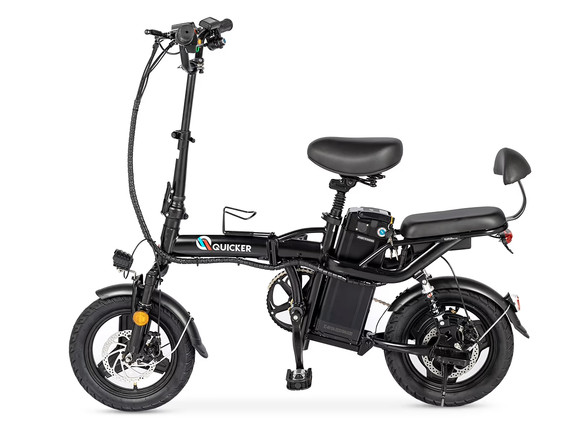 אופני Quicker Mini אופניים חשמליים מתקפלים מצויד בבולמי זעזועים קדמיים ואחוריים בשמן, אופניים חשמליים אלה מגיעים מצוידים במגוון תכונות שימושיות, כולל כיסא הרכבה, מעמד נייד מובנה, רגליים למושב האחורי, מעמד לבקבוק שתייה,צפצפה איתותים ושיכוך בכיסא